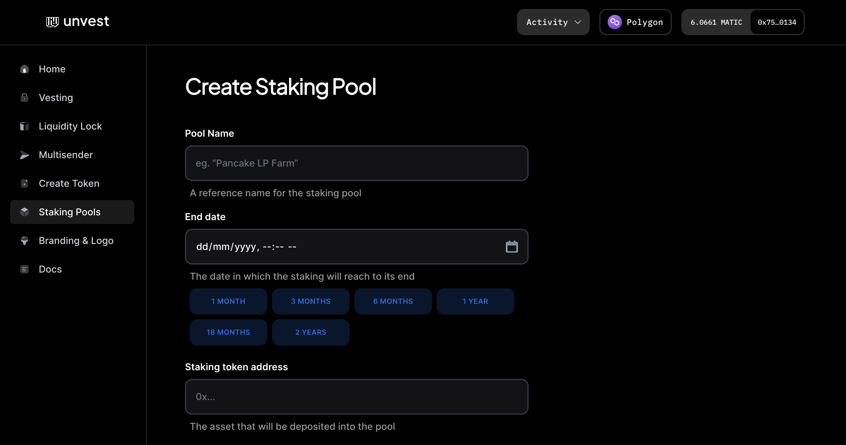- End date: the date when the staking period will end and rewards will cease being distributed