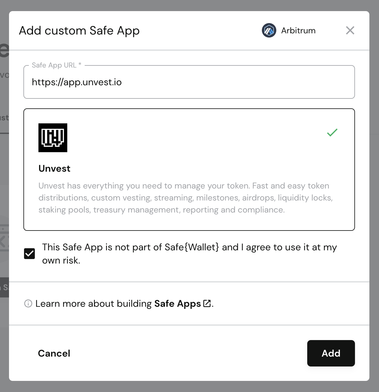 Once you are in the Safe web, you will need to open Unvest App.If this is your first time you will have to create a custom app: