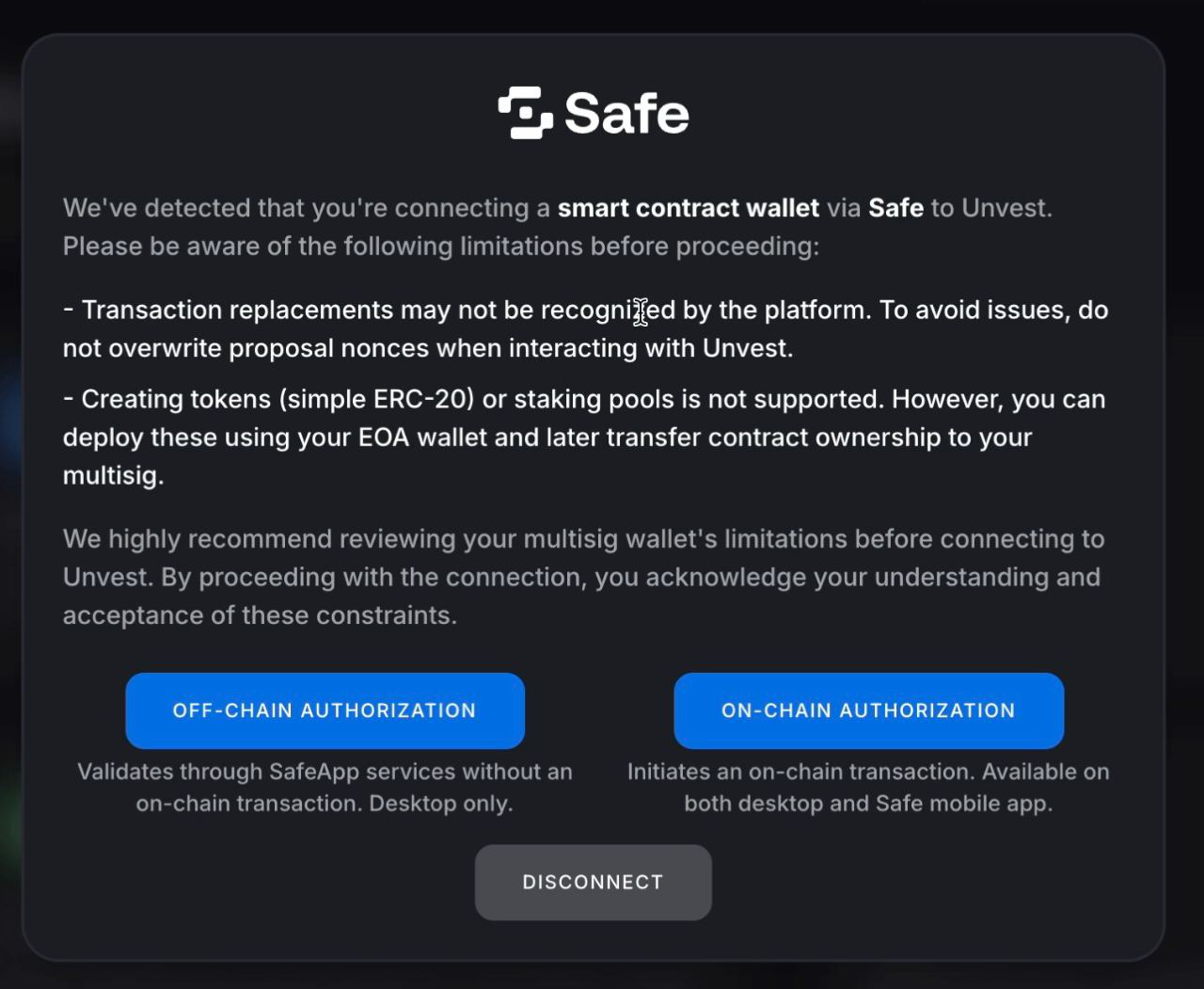 In case you are going with the off-chain authentication, take note that owners will be required to accept the message in a desktop, as this feature is not available yet in Safe mobile app. Also, we recommend you not to switch wallets within the same browser while authenticating.