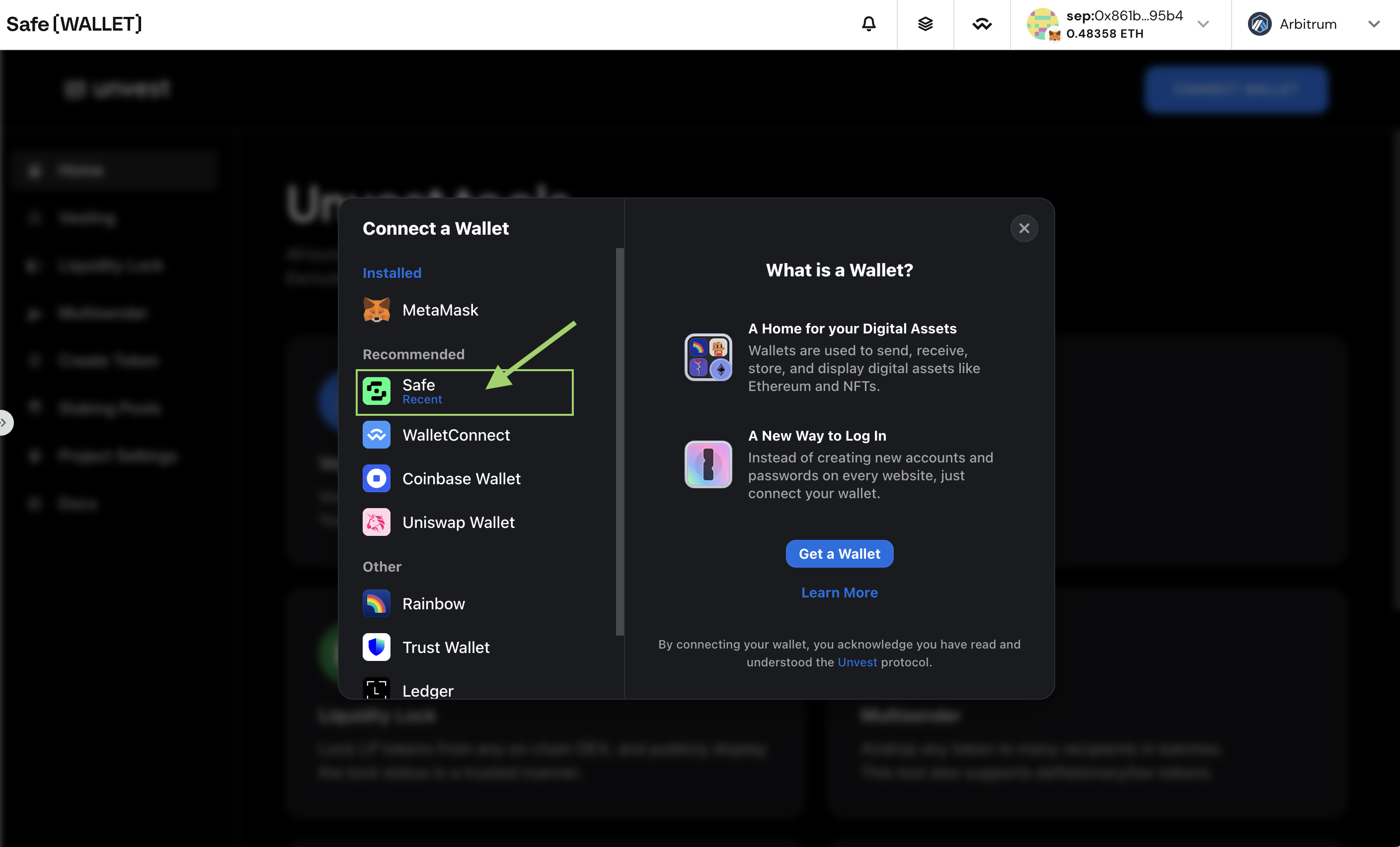 https://app.unvest.io for Unvest mainnets or https://test.unvest.io for Unvest testnets.Go to SafeApp