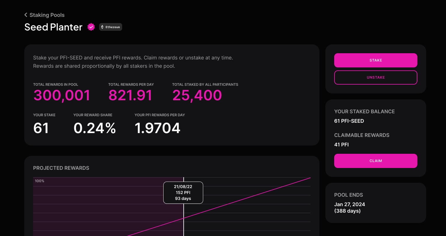 - Once staked, you can view staking stats on this page. You can claim rewards periodically at any time, and you can add to your stake or unstake at any time.