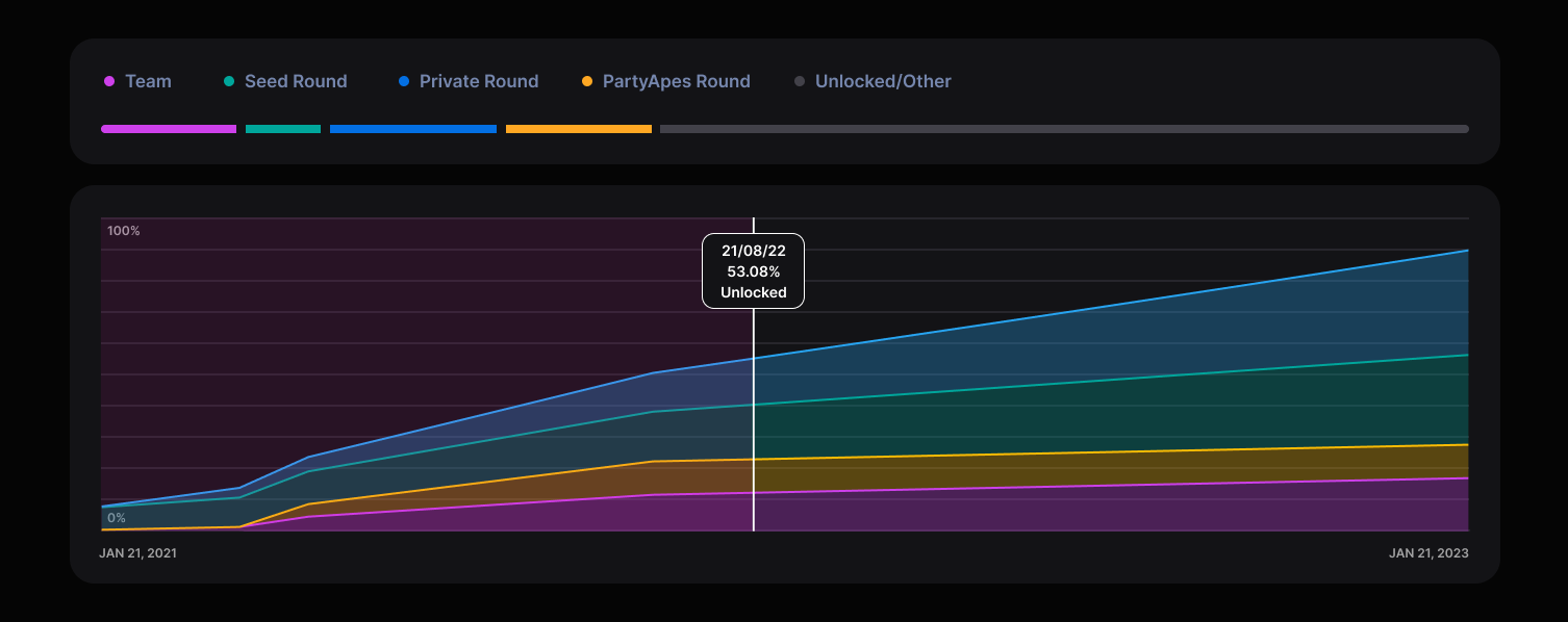 - To view team locks and other token distribution information, click on the “View token locks” panel. This will show you the entire token supply, the rate at which all tokens unlock, and the breakdown between different allocations such as team tokens, marketing tokens, etc.