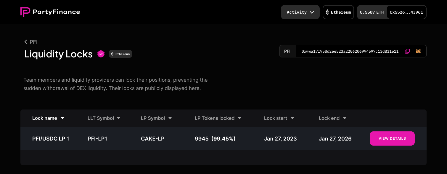 - To view liquidity locks, click on the “View LP locks” panel. This will show you all liquidity locks for the project, including the amount of tokens locked, the end date of the lock period, and the status of the lock. Click on a specific lock for more details.