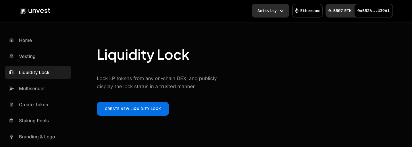 - Navigate to the “Liquidity Locks” page on the Unvest dashboard.