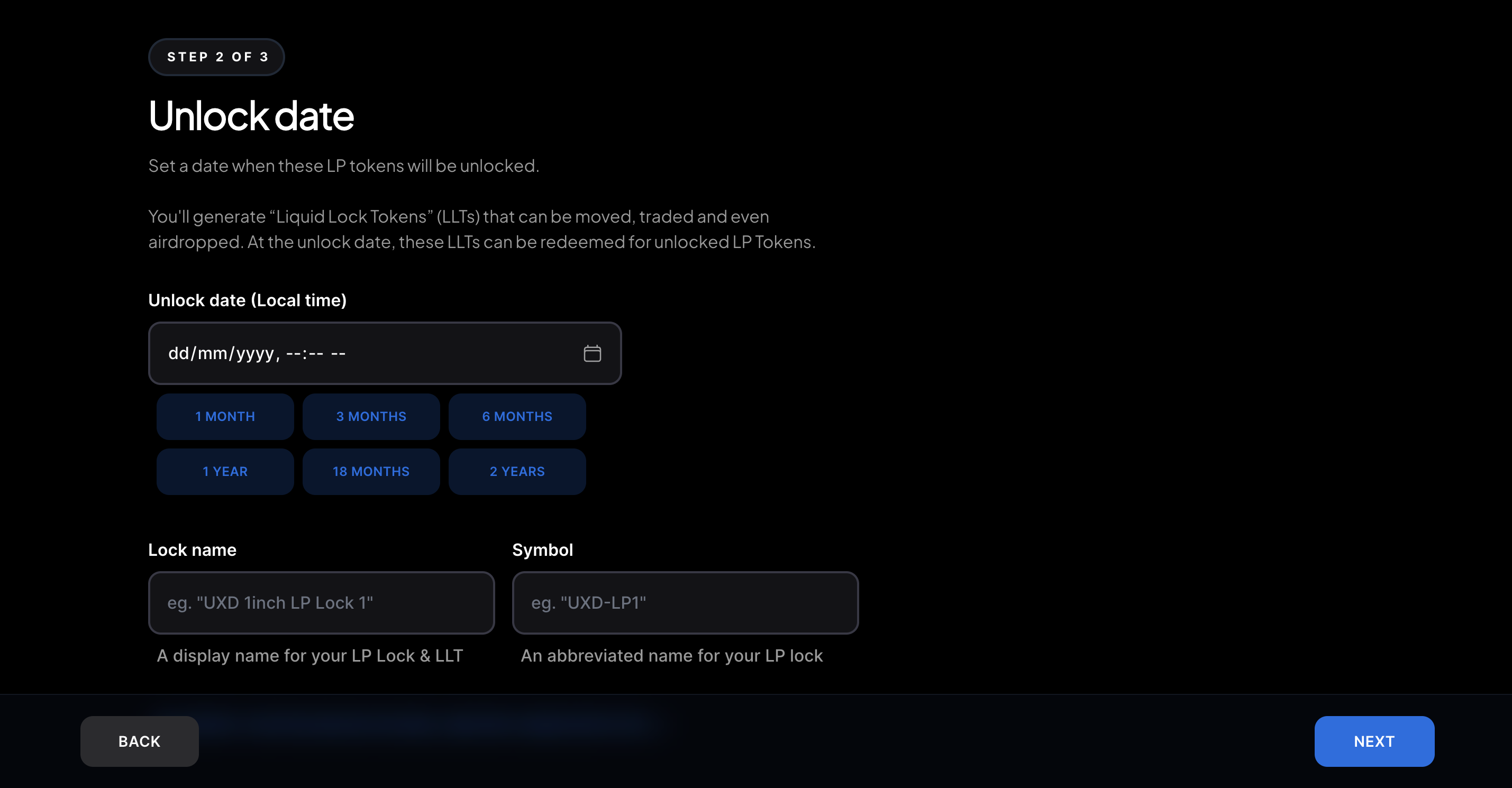 - Select a lock name and symbol, this is important as they are displayed publicly and cannot be changed later. These names will also be used for the liquidLock token that will wrap your LP.
