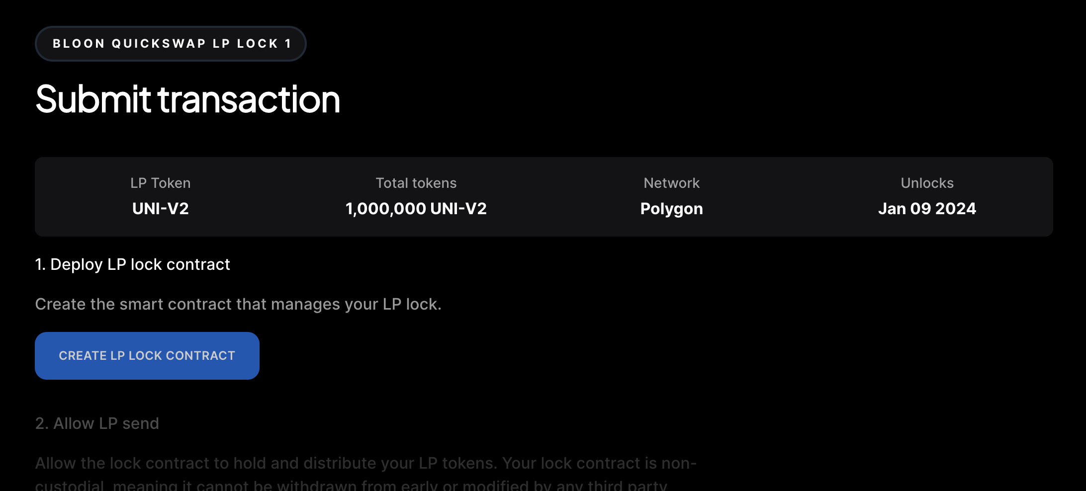 - You will be prompted to submit transactions to the blockchain to create the liquidity lock. Make sure you have sufficient balance in your wallet to cover the gas fees for this transactions.