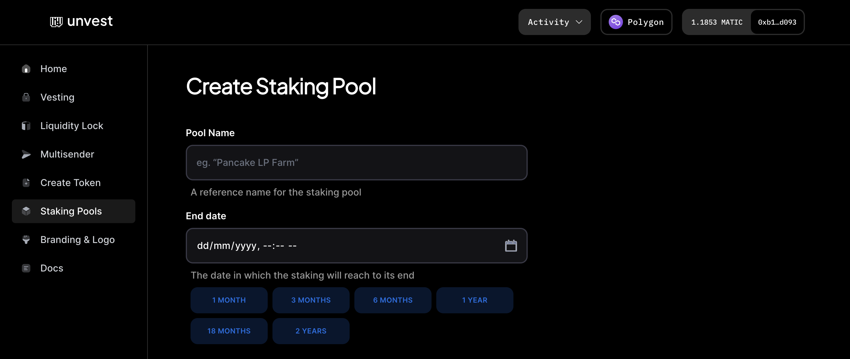 - In the “Pool Name” field, enter a reference name for the staking pool.
