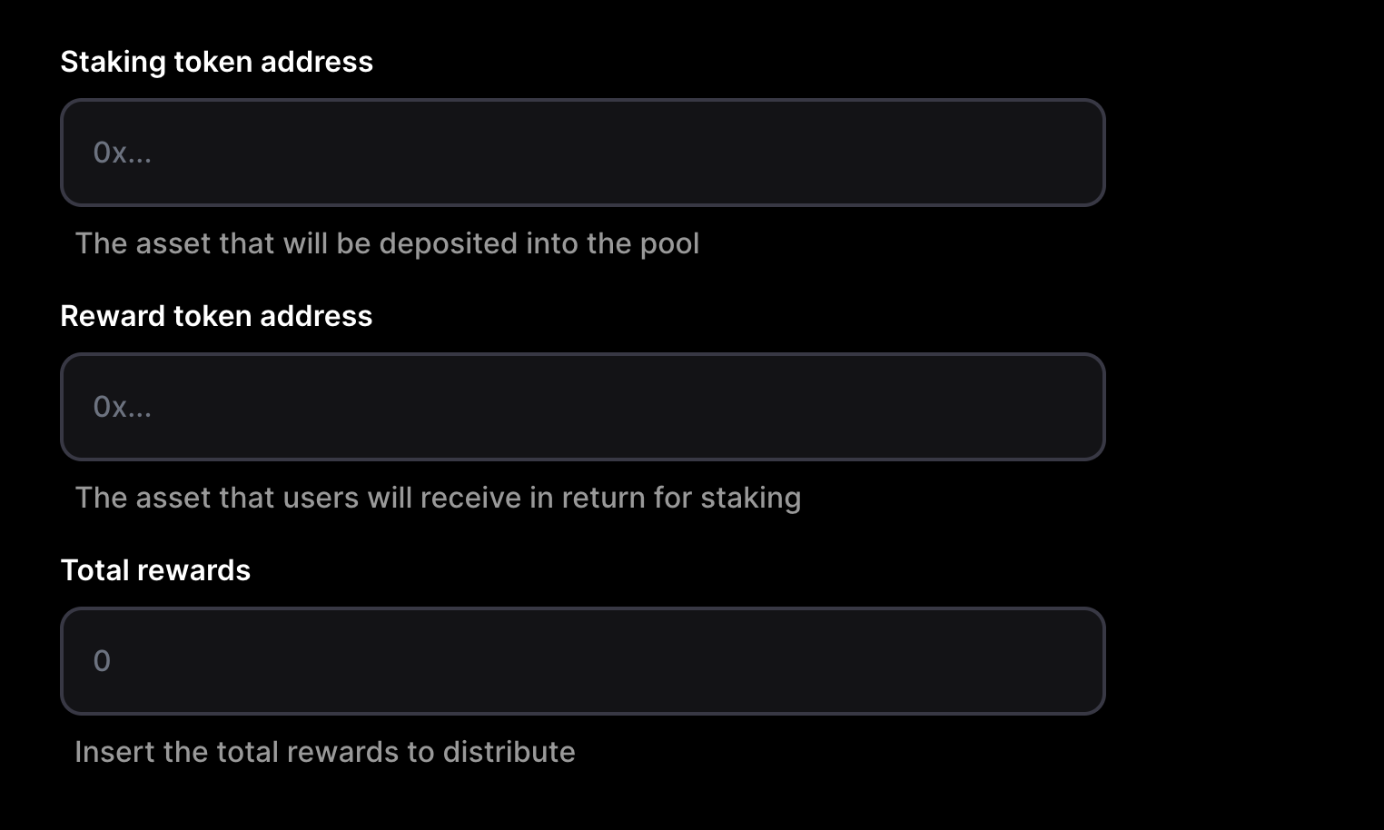- In the “Staking Token Address” field, enter the address of the asset that will be deposited into the pool. This will usually be your unlocked project token.