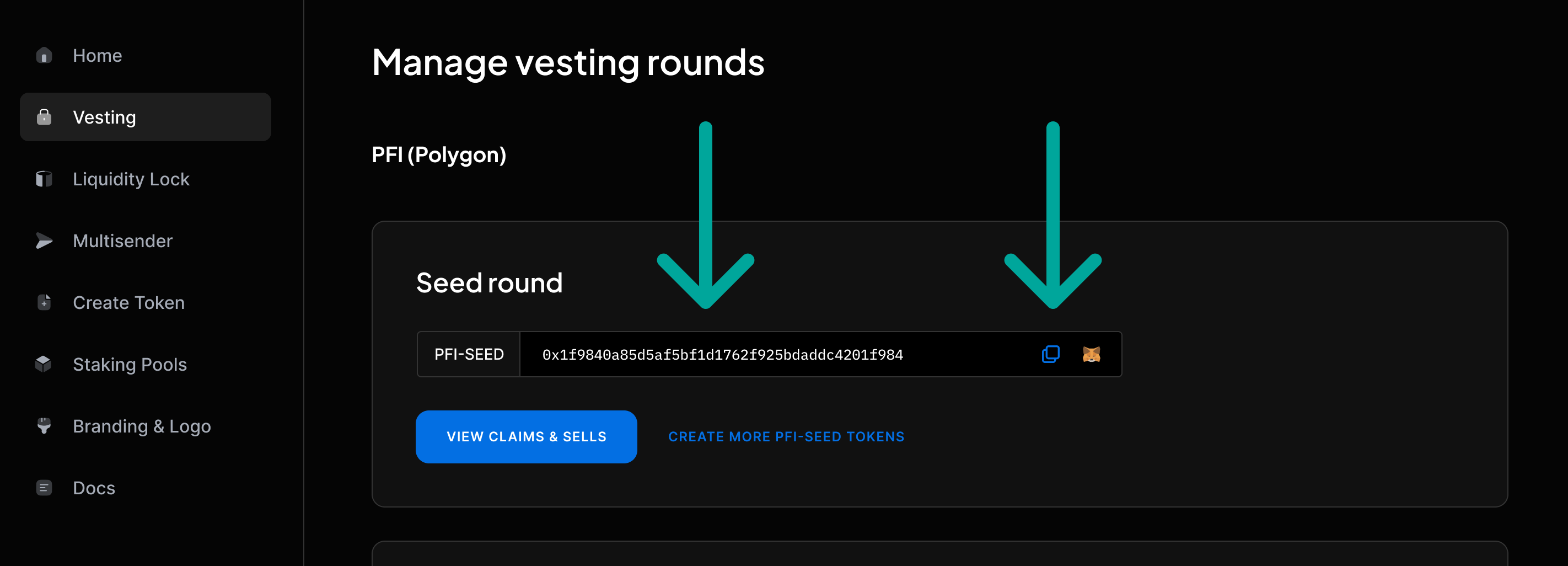 - In the “Reward Token Address” field, enter the address of the vestingToken that users will receive as a reward for staking. You can get the vesting token address from your Project dashboard.