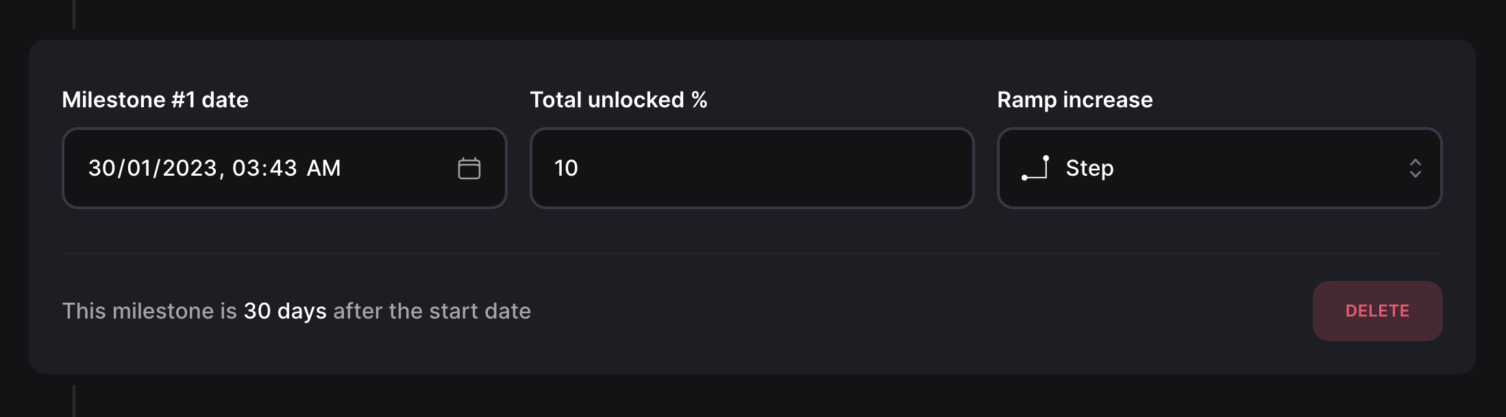 - To create the 10% monthly unlock schedule, click the “Add milestone” button to add a new milestone widget. In the date picker, select the first of the month that you want the 10% unlock to occur. In the unlock percentage field, enter the cumulative percentage of tokens that should be unlockable after this milestone. For example, the first milestone should be 10%, the second 20%, the third 30%, and so on. In the ramp increase dropdown, select “step”.