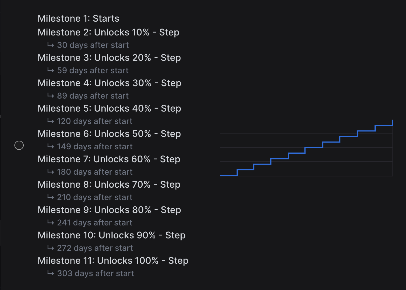 - Your vesting round is now set up with a monthly step unlock schedule, with 10% of the tokens unlocking on the first of each month until the vesting period is complete.